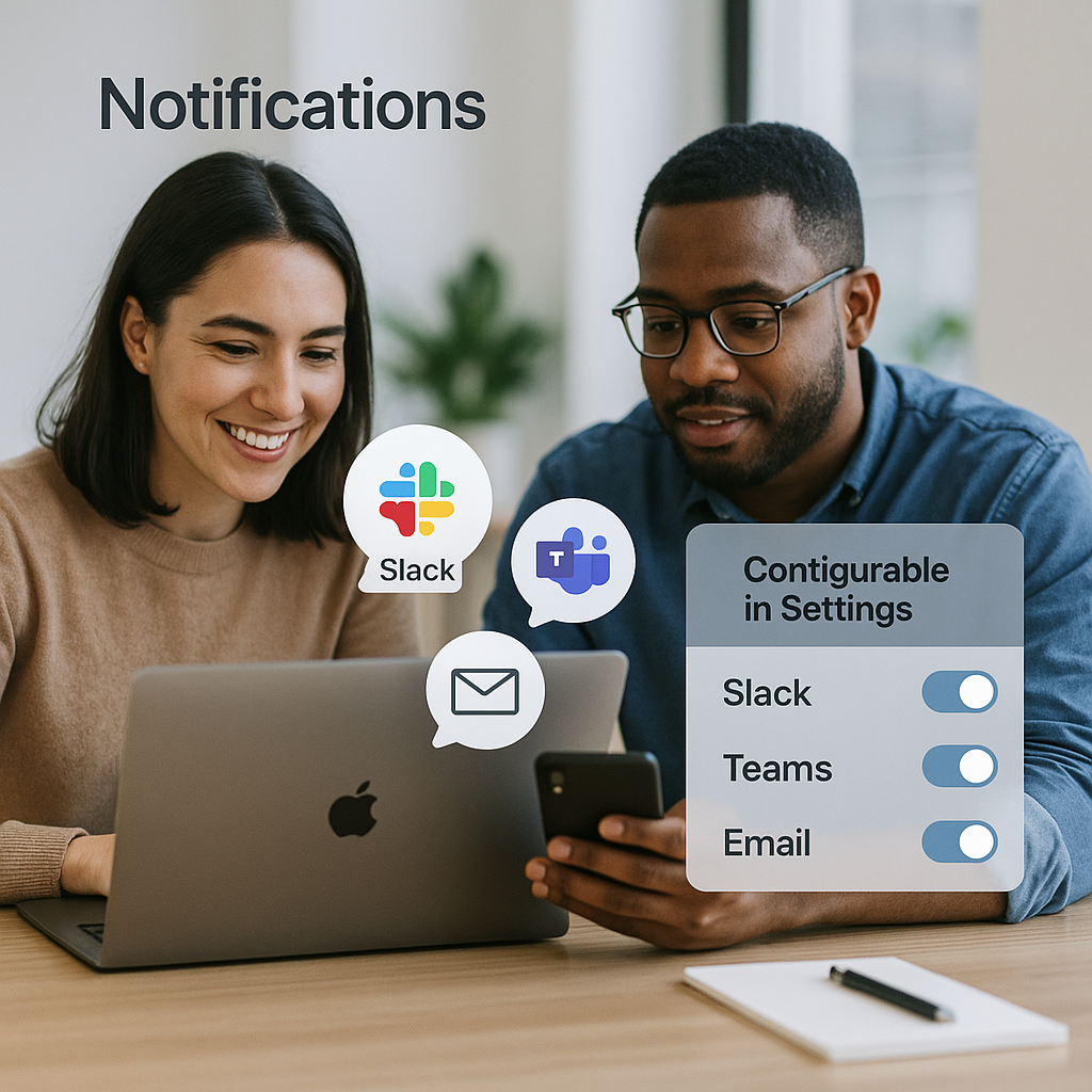 Slack, Teams and Email notifications, configurable in Settings.